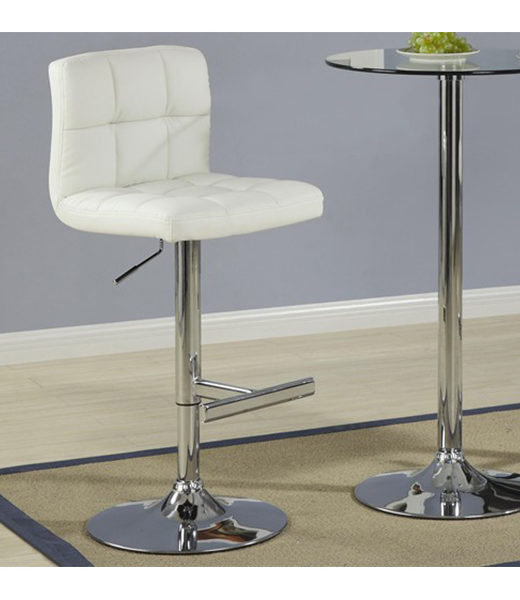 A stylish look for get-togethers and sleek dining, choose this White bar stool for your space. The chrome finished metal pedestal base with footrest adjusts the seat height. In all, the height of the stool adjusts from 36.25″ to 41.50″ inches high. The White seat with a padded straight line roll back and seat design makes this barstool a comfortable and visually appealing accent at a bar counter or with the chrome finish base bar table.