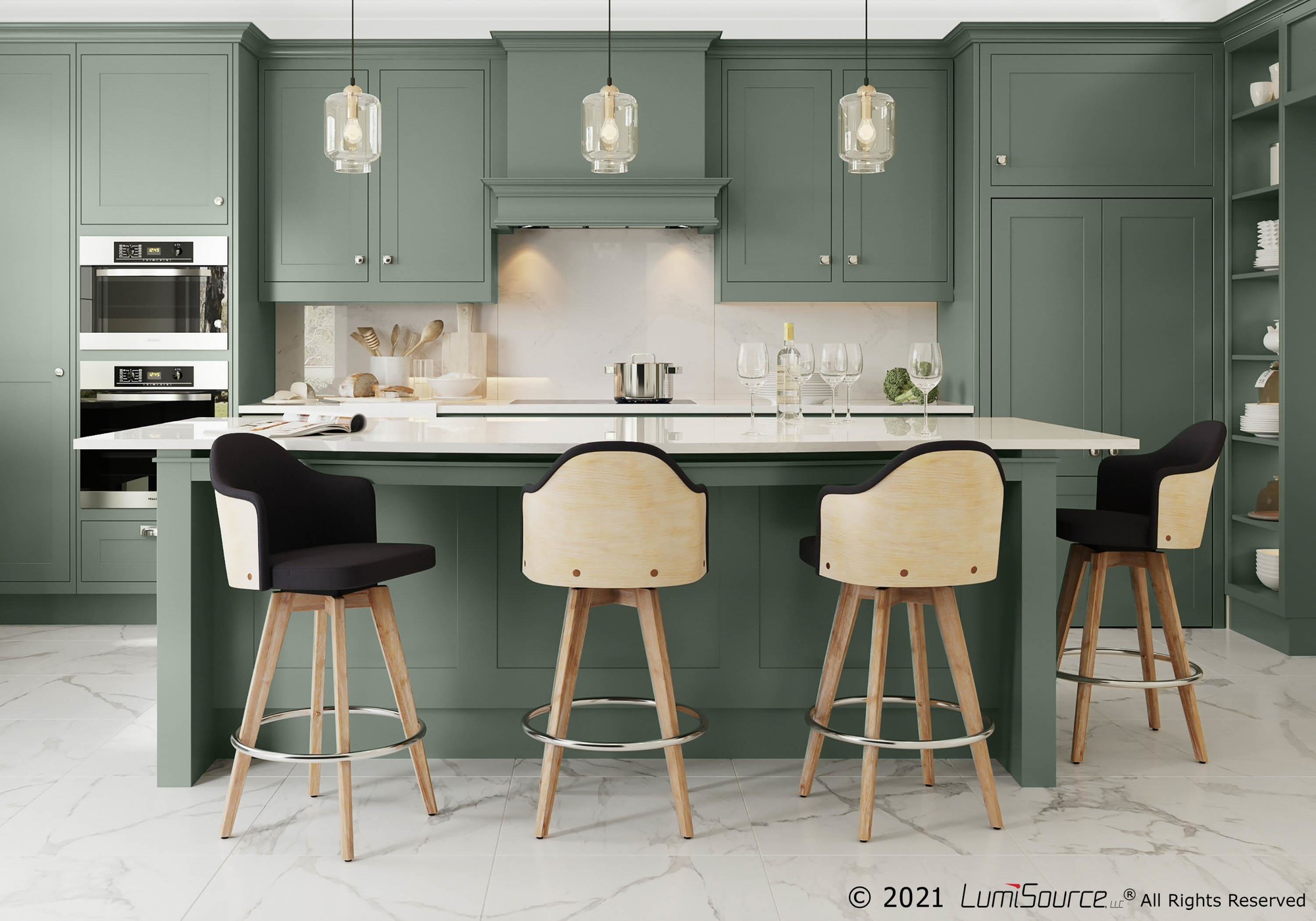 The contemporary charm of the Ahoy Counter Stool by LumiSource combines sturdy construction with aesthetic appeal. Sleek fabric upholstery accented by a bamboo back and stylish bamboo legs. Available in a variety of color and pattern combinations.