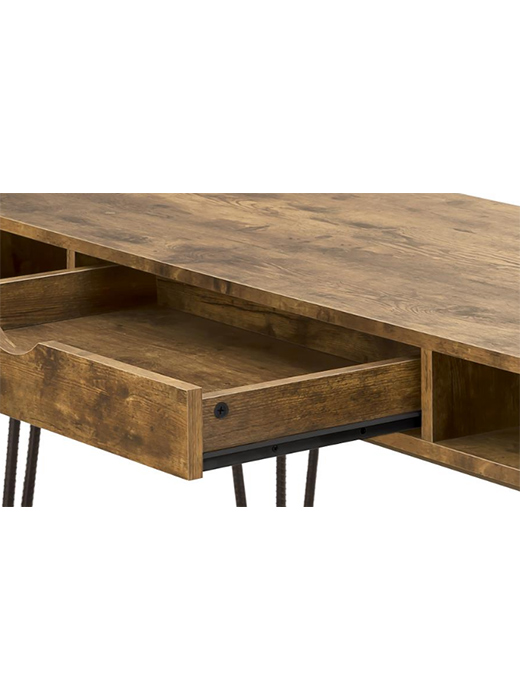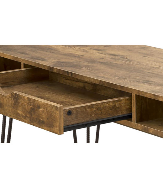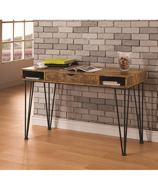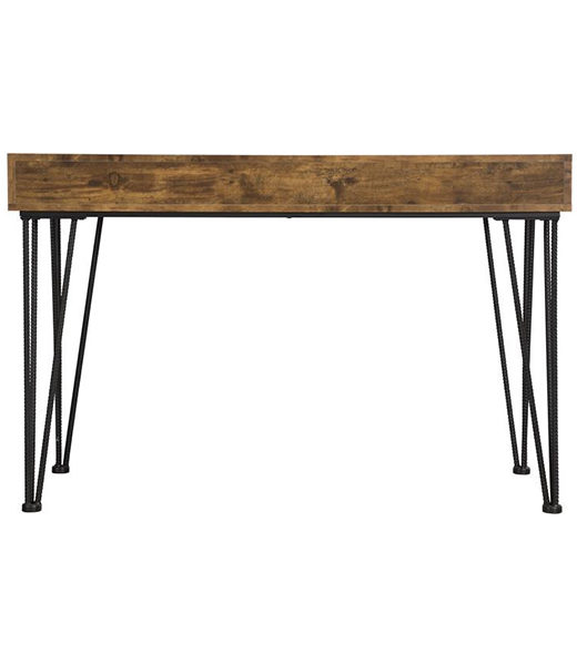 Industrial Style Writing Desk Finished In Antique Nutmeg With Metal Rebar Legs.