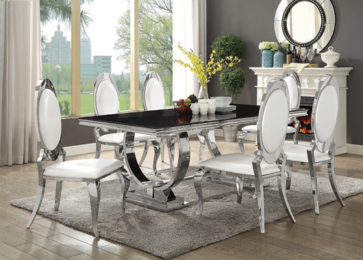 This dining table has a unique design that’s an ideal complement to a contemporary style home. Large rectangular top is finished in black with silver edges. Silver legs are fashioned in a ring-like circular design atop two silver tiered bases. With a set of well-made chairs, this lustrous table is a brilliant centerpiece of any dining room. Enjoy years of everyday use with this modern yet timeless design.
