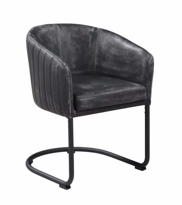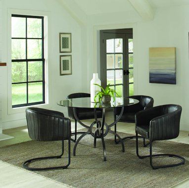 Curves abound on this intriguing transitional glass dining table. Featuring a casual and inviting aura, the table boasts a round of clear glass resting on a bold base. The base shows off metal construction with four stylized M legs that meet in an interlocking ring motif. A gunmetal finish lends a rich final touch. This 30-inch table is perfect for a stylish breakfast nook or eat-in kitchen.