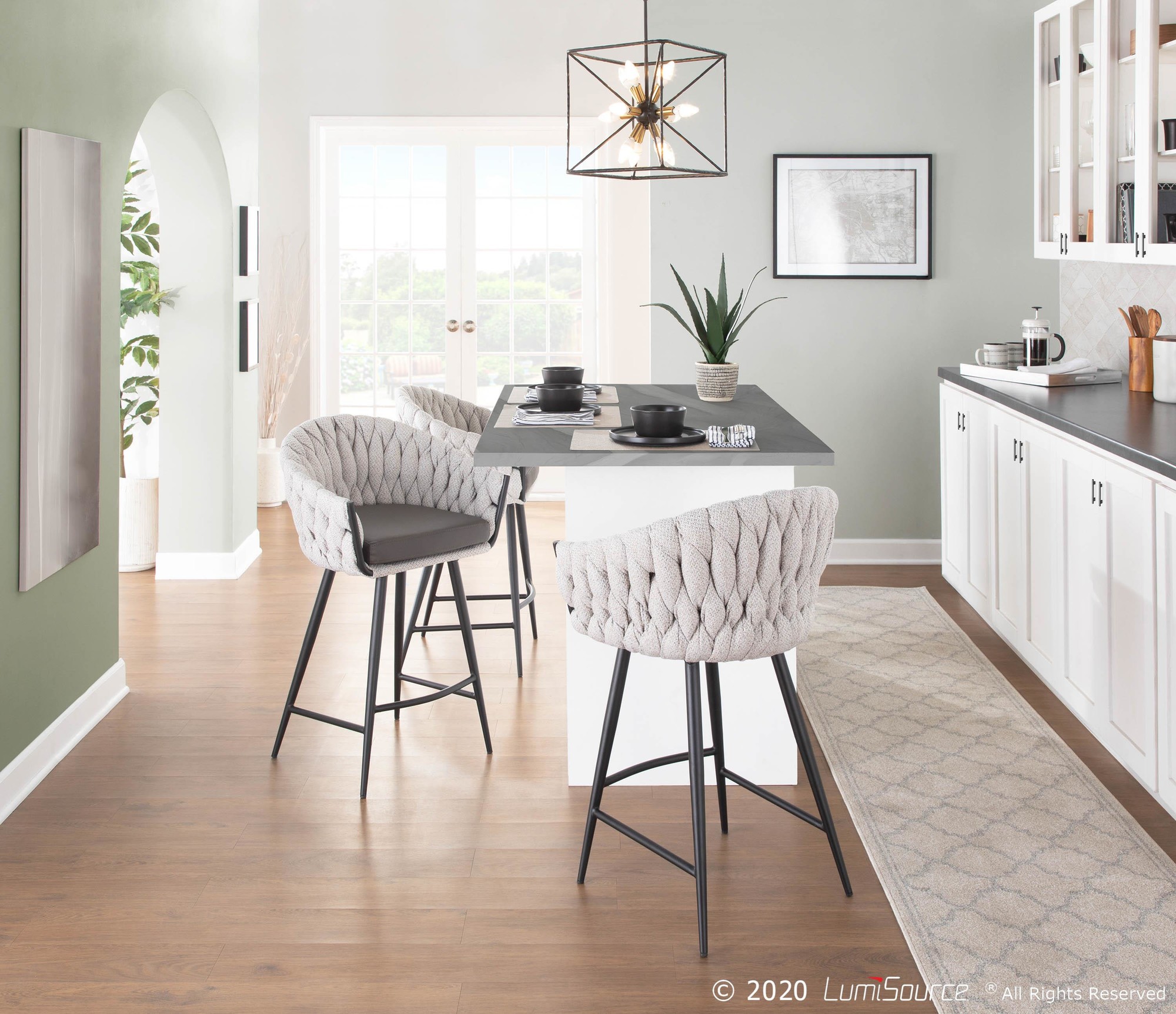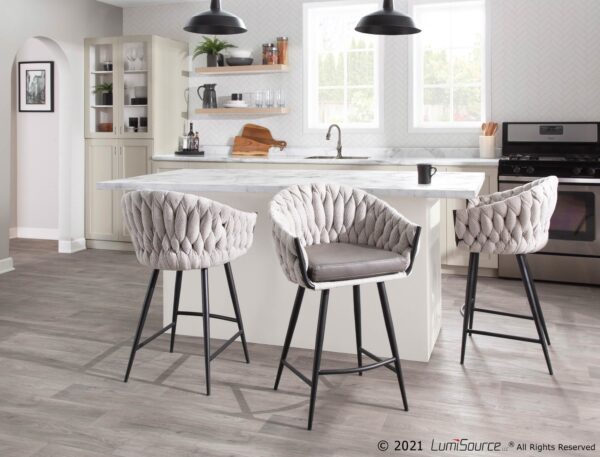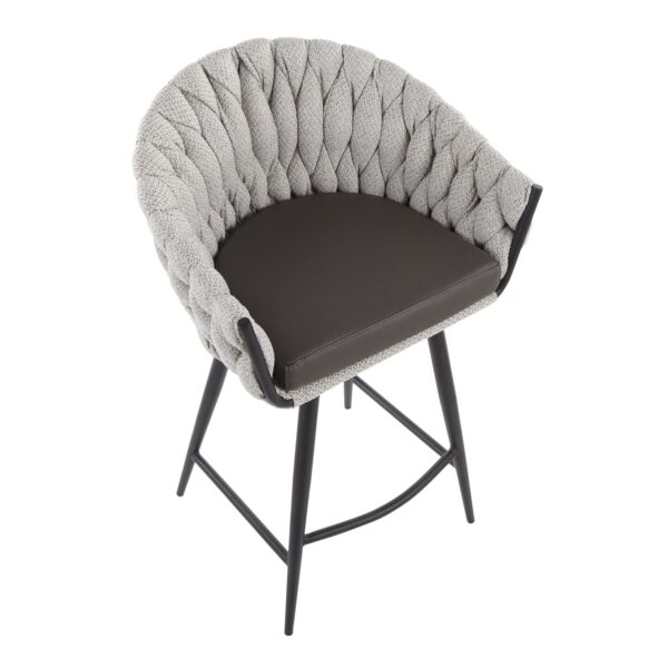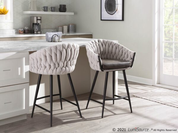The contemporary design of the Braided Matisse Counter Stool features unique “braided” fabric and faux leather upholstery, padded bucket style seat and sleek black metal tapered legs and a footrest for comfort. Perfect for your bar or counter area, the Matisse comes in a variety of colors.