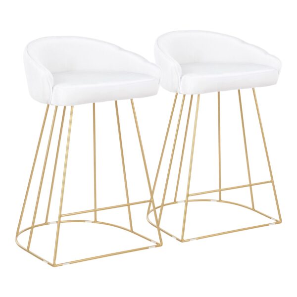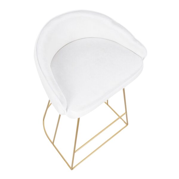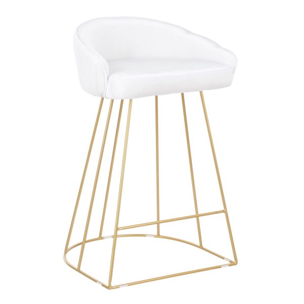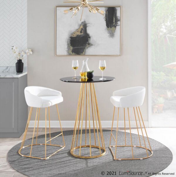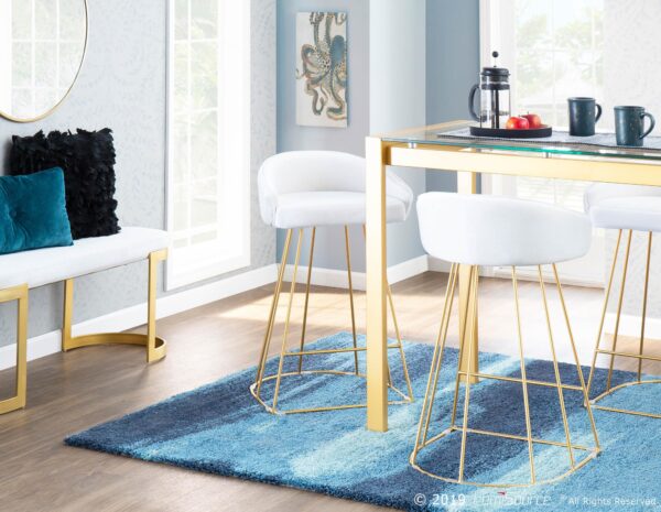 Opulent and confidently contemporary – that’s the Canary Counter Stool by LumiSource. Features a captivating cage-like gold tone metal base with footrest, subtle curved backrest, and an elegant upholstered seat available in various modern colors. Definitely a bold touch of fancy for your seating needs.