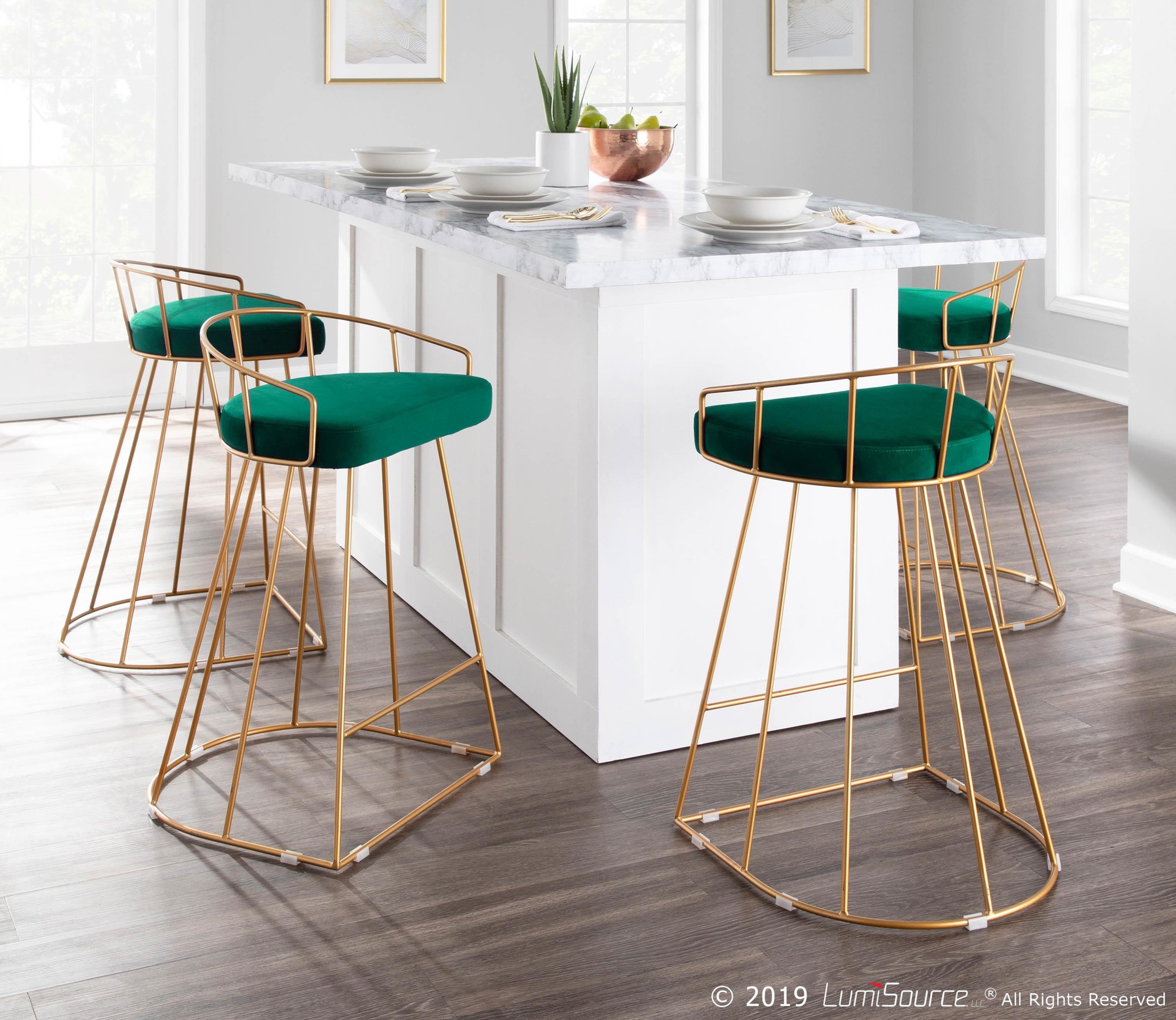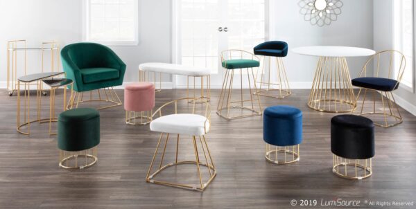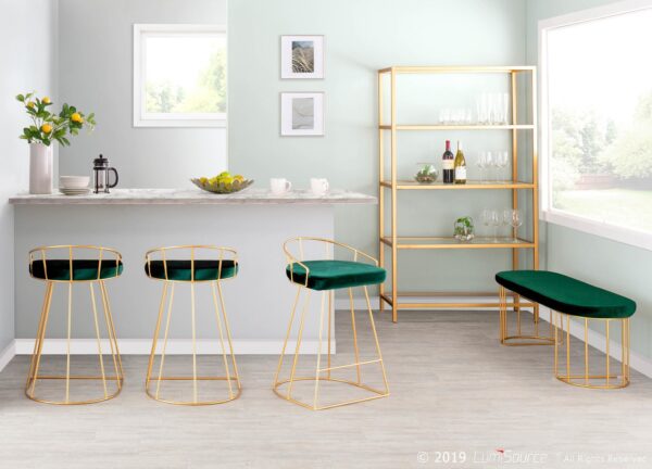 Opulent and confidently contemporary – that’s the Canary Counter Stool by LumiSource. Features a captivating cage-like gold tone metal base with footrest, subtle curved backrest, and an elegant upholstered seat available in various modern colors. Definitely a bold touch of fancy for your seating needs.