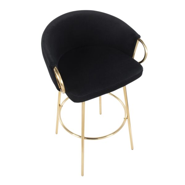 Chic modern style shines bright with the unique design of the Claire Fixed-Height Bar Stool by LumiSource. With a rounded and low backrest, sleek gold armrests, and gold metal frame, it’s the perfect piece for your contemporary bar area. The Claire Bar Stool has smooth swivel capability with lush velvet upholstery. Available in various bold colors.