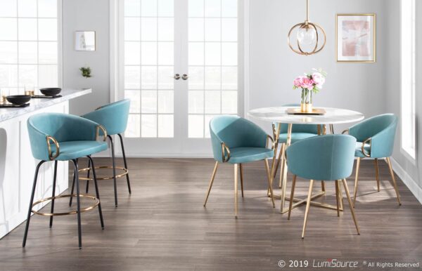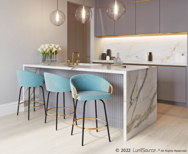 Chic modern style shines bright with the unique design of the Claire Bar Stool by LumiSource. With a rounded low backrest, sleek black armrests and a black metal frame, it’s the perfect piece for your contemporary bar area. The Claire Counter Stool has smooth swivel capability with lush velvet upholstery. Available in various bold colors.