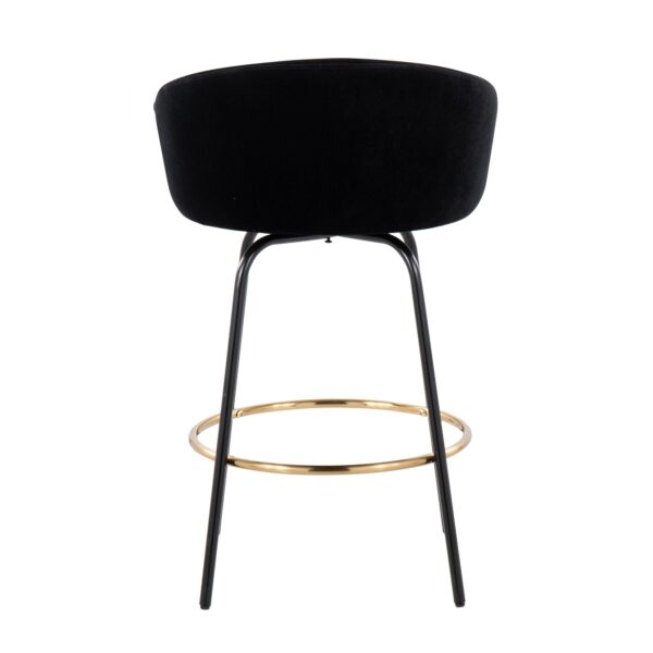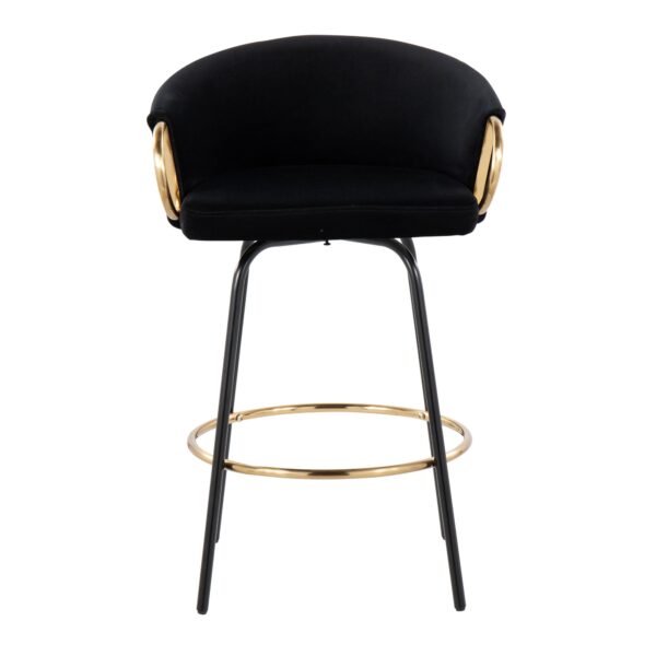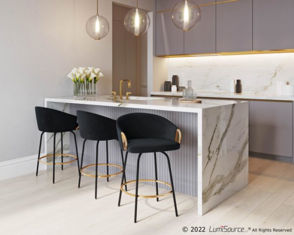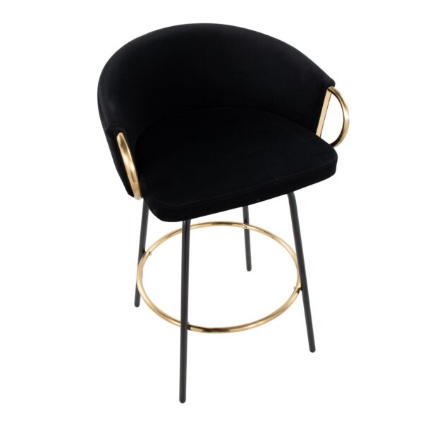 Chic modern style shines bright with the unique design of the Claire Bar Stool by LumiSource. With a rounded low backrest, sleek black armrests and a black metal frame, it’s the perfect piece for your contemporary bar area. The Claire Counter Stool has smooth swivel capability with lush velvet upholstery. Available in various bold colors.
