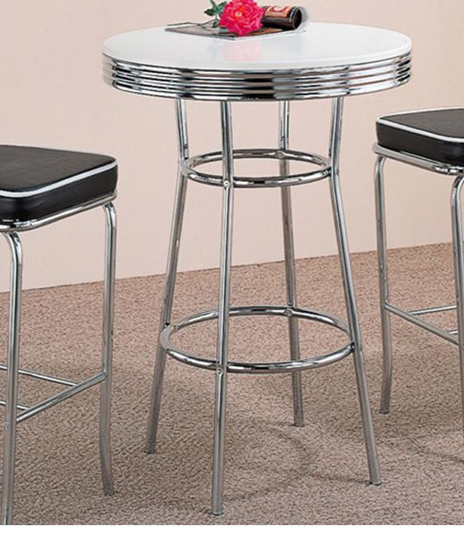 Rewind time and create an entertaining dining experience with the retro designs of this 50’s soda fountain bar table. The round top in a white finish, rippled chrome rim, and chrome single pedestal compose a distinctive look. Pair with the coordinating chrome plated pub chairs for a complete 1950’s diner appeal!