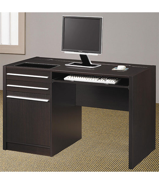 Contemporary design office desk in a dark wood finish. Features storage drawers and power strip built in to charge your everyday electronic accessories. Matching bookcase features storage drawer and shelves. Some assembly required.