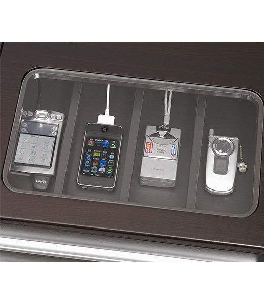Contemporary design office desk in a dark wood finish. Features storage drawers and power strip built in to charge your everyday electronic accessories. Matching bookcase features storage drawer and shelves.