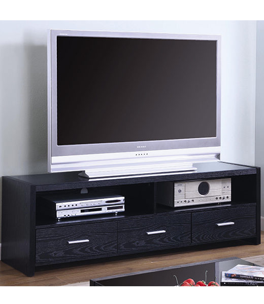 Contemporary Media Console A modern TV console with 3 large drawers and 2 large compartments. Finish Color – Black Maximum TV Weight is 88 POUNDS Dimensions: Width: 61.375  x  Depth: 17.75  x  Height: 19.875