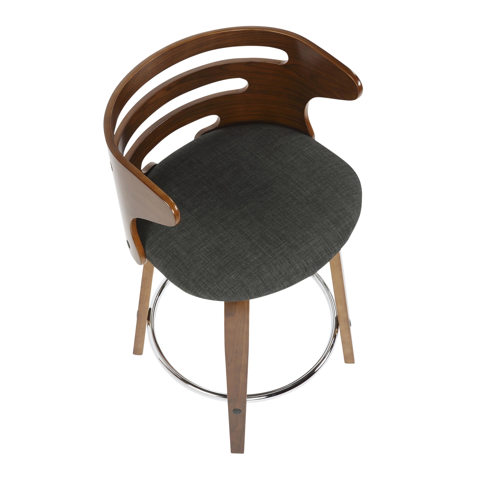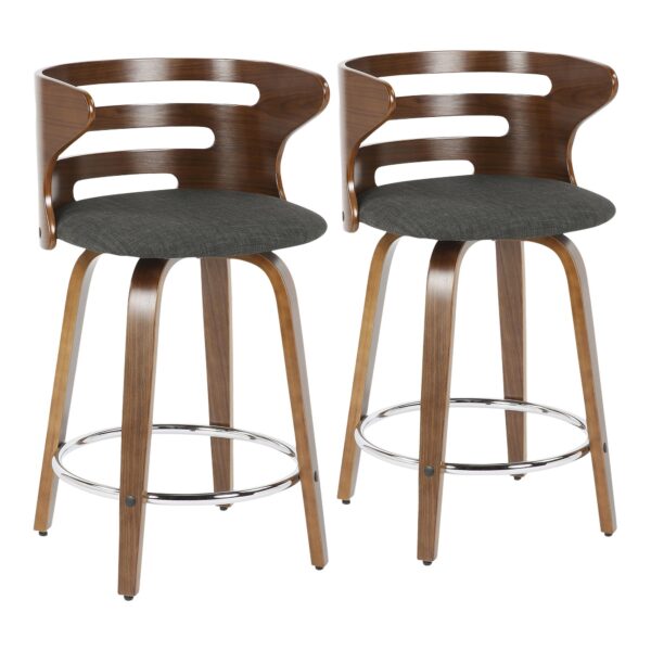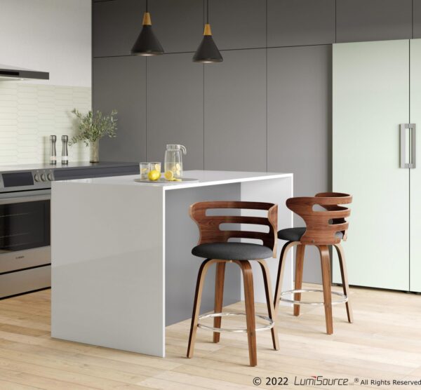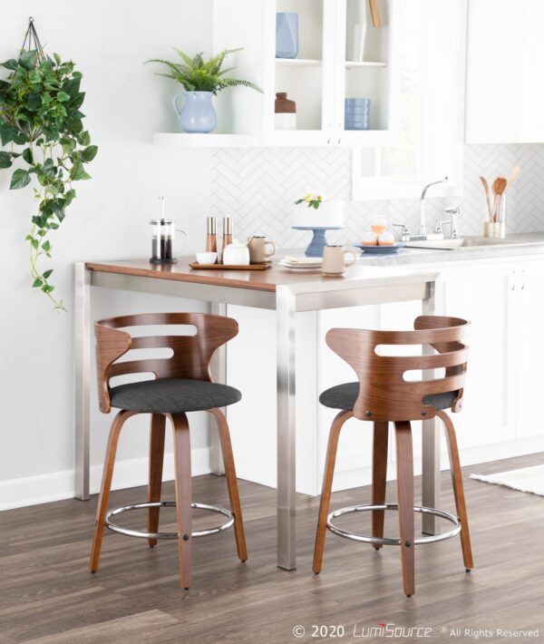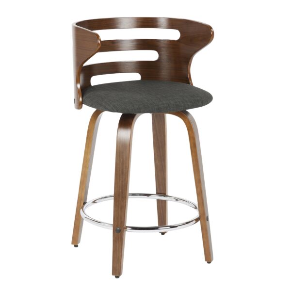 The walnut wood backrest of the LumiSource Cosini Barstool hugs the body with graceful, curved lines. Tapered bent wood legs are joined by a circular chrome footrest for support and durability. Add in a cushioned upholstered seat and the Cosini Barstool becomes go-to seating for any group gathering.