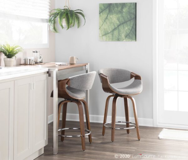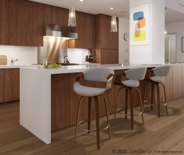 With a curvaceous dose of Mid-Century style, the Curvini Counter Stool by LumiSource will look great at your counter area. Featuring a walnut-finished stationary wood frame, luxurious woven fabric upholstery, swivel seat, and stylish armrests. The Curvini is available in various finishes, choose the color that fits your space the best.