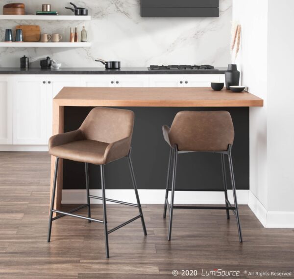Add stylish and comfortable seating to your kitchen or counter area with the industrial charm of the Daniella Counter Stool by LumiSource. Featuring a sleek faux leather upholstery, padded seat, and backrest and a unique black metal frame. The Daniella is available in a variety of upholstery colors.
