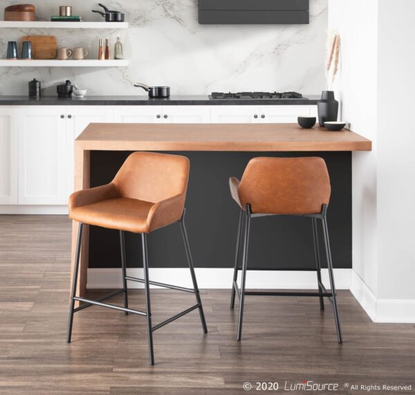 Add stylish and comfortable seating to your kitchen or counter area with the industrial charm of the Daniella Counter Stool by LumiSource. Featuring a sleek faux leather upholstery, padded seat, and backrest and a unique black metal frame. The Daniella is available in a variety of upholstery colors.