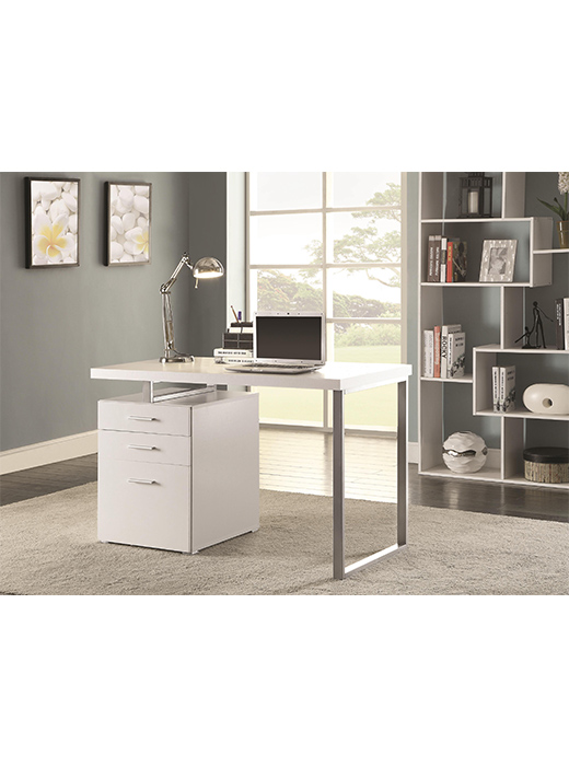 Two office supply drawers and one hanging file drawer for optimal Desk organization.