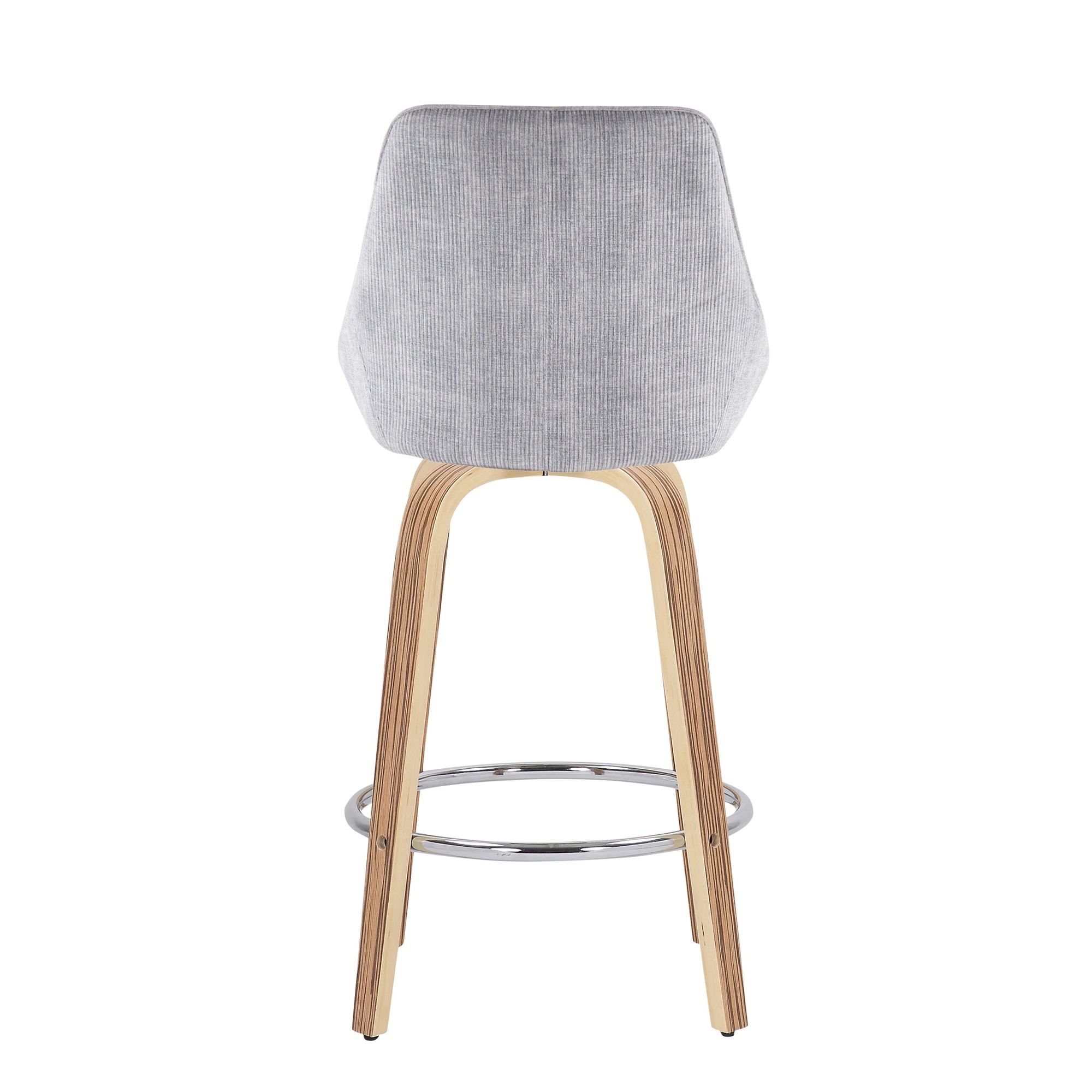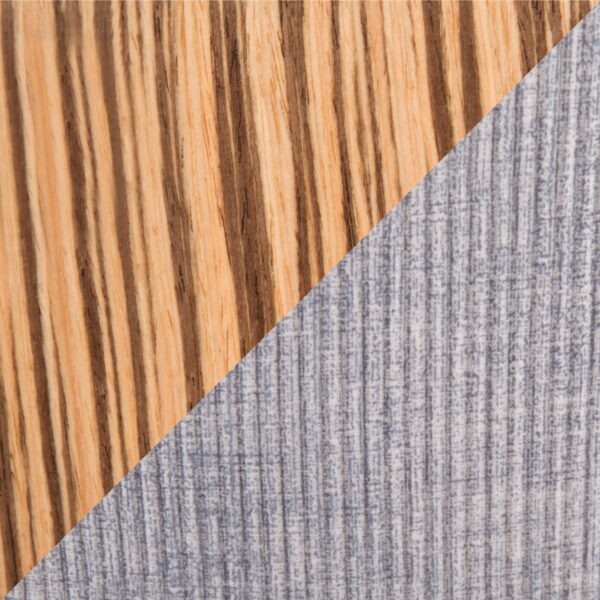 Finished in Zebra Wood, Grey Corduroy, Chrome