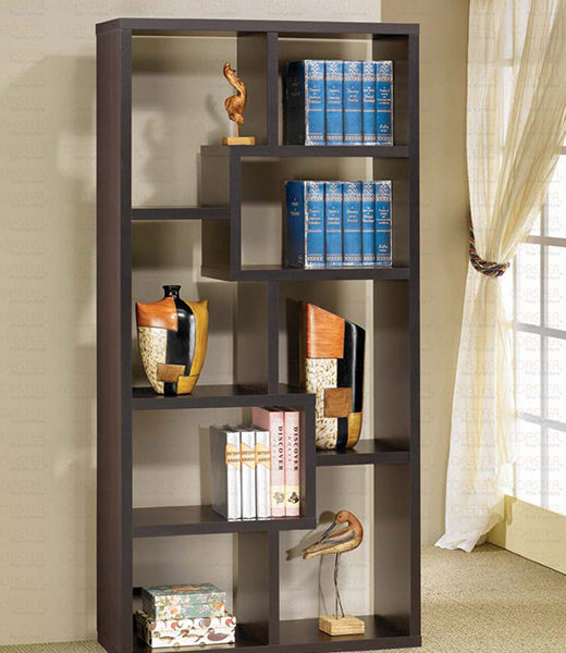 A contemporary bookcase in deep Cappuccino. Backless with an asymmetrical design. Eight compartments in various sizes.