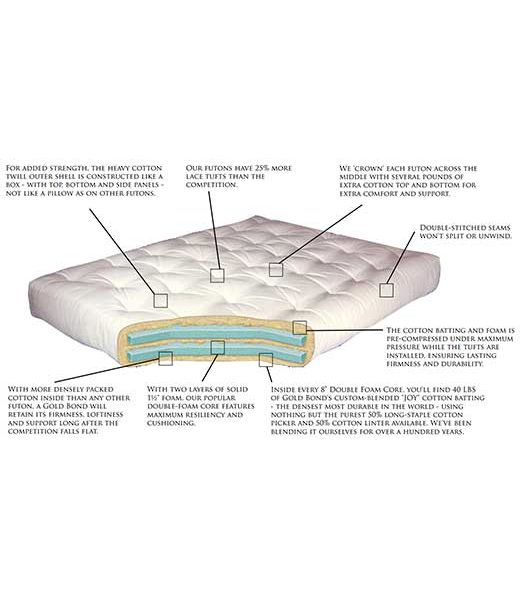 With more densely packed cotton inside than any other futon, will retain its firmness, loftiness and support long after the competition falls flat. Each futon is crowned across the middle with several pounds of extra cotton top and bottom for extra comfort and support.