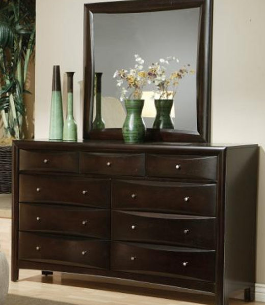 A very well made contemporary dresser with optional mirror. The dresser offers good bedroom storage space. A clean shape for a modern look. Chambered drawer fronts and chamfered molding trim. Six large lower drawers will accommodate clothing and bedroom linens, while three smaller top drawers are perfect for small clothing items. Simple contemporary metal knobs accent each drawer front. Above, the mirror features a smooth wooden frame around square mirror glass, adding light to your room. This combo will blend beautifully with your decor.