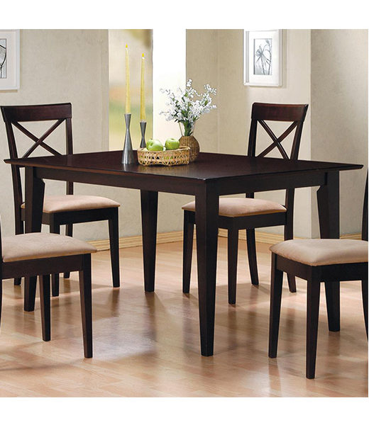 This entire featured collection is finished in rich cappuccino. Constructed of solid hardwoods and wood veneer table tops. All chairs shown are of the same finish allowing you to choose the style.