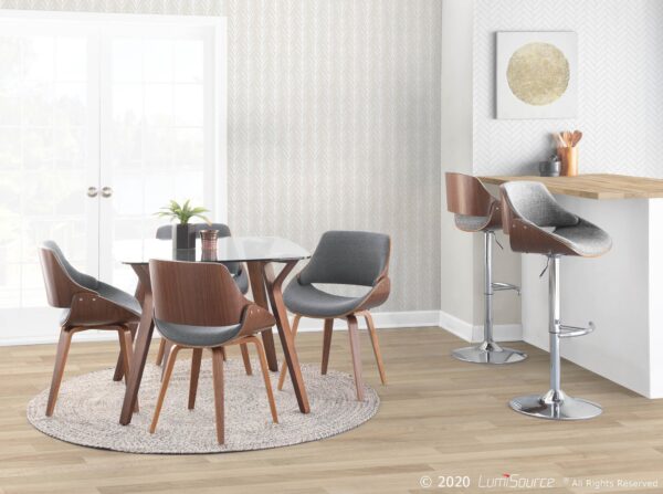 The wide welcoming seat of the LumiSource Fabrizzi Barstool beckons for one to sit and unwind for a while. A scooped, contoured seat and curved back add to its modern yet chic design. The chrome steel swivel base adds beautiful contrast to the woven upholstery. This is an ideal selection for kitchen seating or a home bar.