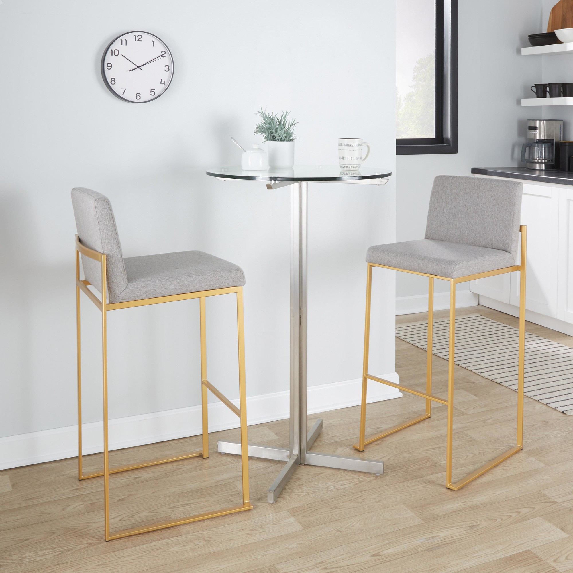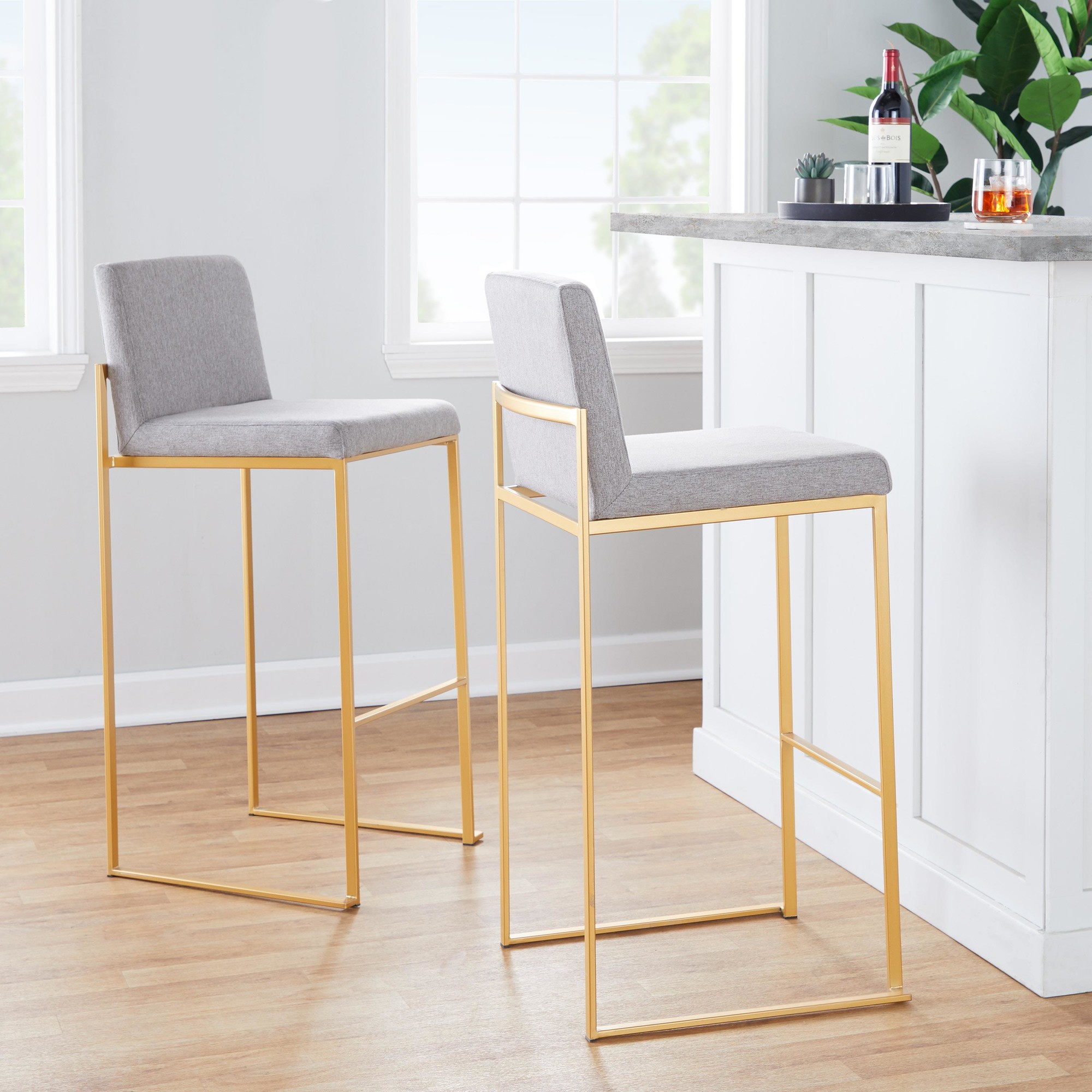 Modern elegance at its finest, the Fuji High Back Bar Stool by LumiSource features an extra-wide (and extra comfortable) upholstered seat, a high padded backrest, and a stylish metal frame. The perfect contemporary counter stool, the Fuji is available in a stainless steel, gold, or black metal frame and comes in a variety of sleek upholstery colors.