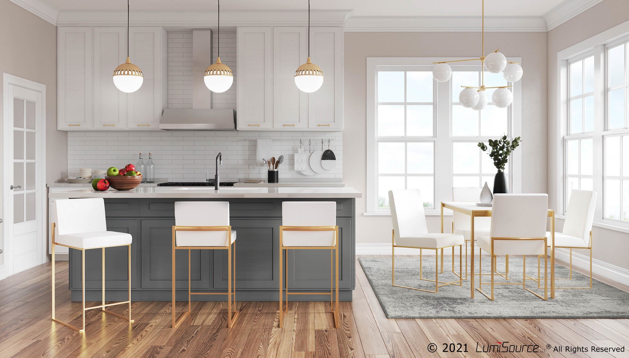 Modern elegance at its finest, the Fuji Stacker Bar Stool by LumiSource features an extra-wide (and extra comfortable) upholstered seat, a high padded backrest, and a stylish metal frame. The perfect contemporary counter stool, the Fuji is available in a stainless steel, gold, or black metal frame and comes in a variety of sleek upholstery colors.