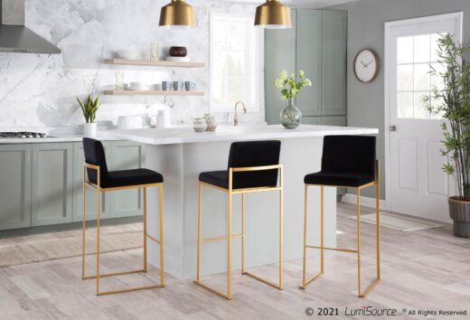 Modern elegance at its finest, the Fuji Counter Stool by LumiSource features an extra-wide (and extra comfortable) upholstered seat, a high padded backrest, and a stylish metal frame. The perfect contemporary counter stool, the Fuji is available in a stainless steel, gold, or black metal frame and comes in a variety of sleek upholstery colors.