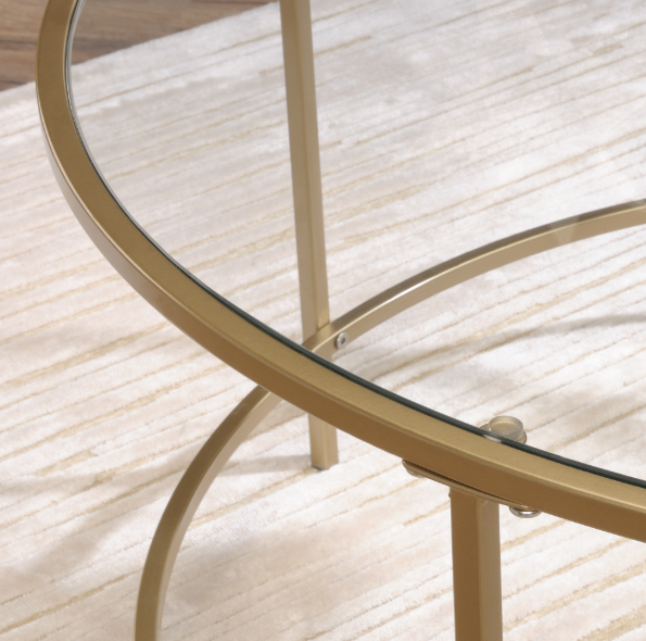 Enjoy this nice glass top coffee table with metal base, and Satin Gold colored finish.
