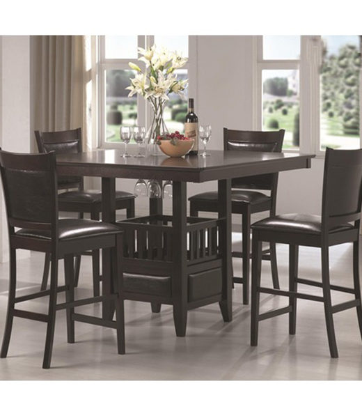 Dine in casual comfort with the five-piece Jaden Counter Height Table & Stool set. Square in shape, the counter height pub table is crafted from select hardwoods and okume veneers with a rich cappuccino finish. A square storage table base includes a center storage cabinet with wine glass holders, allowing you to make the most of your dining space. Vinyl padding on the storage cabinet’s sides adds a visual detail to impress. Accompanied are four counter stools with beautiful black upholstered seats and backs. Wrapped in a leather-like vinyl, these chairs have an upscale look and feel that does not sacrifice durability and comfort. Support stretchers provide sound structure and visual details to impress. Modern with a simple yet stylish design, this table is appropriate for both formal or casual dining environments. Complete your home with the Jaden Pub Table & Chair set.