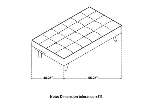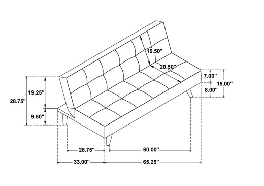 Have a seat on this modern streamlined couch in a neutral color. Click to move the back down for a convenient space to lay down flat and sleep. While we don’t recommend this for your every night bed, it will do for overnight bed guests. Easy to set up, just twist to screw in the legs. We offer setup and delivery to you in Chicagoland. Armless profile and faux leather upholstery. Biscuit tufted upholstery and piping with splay tapered wooden legs. Attached cushions with sinuous spring decking.