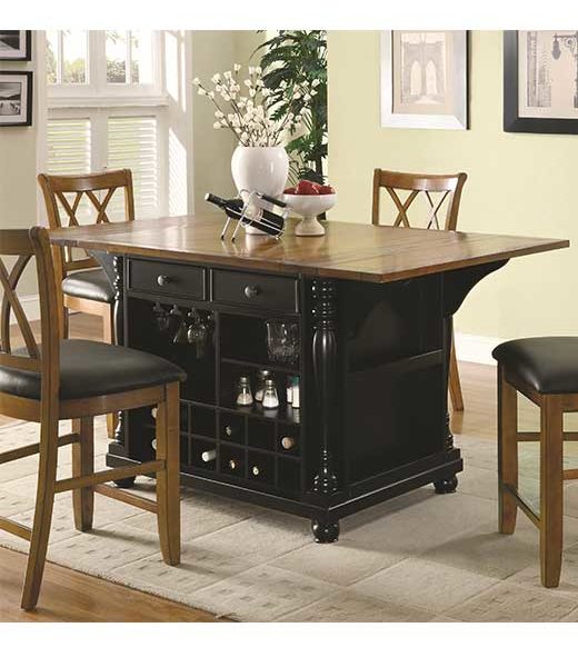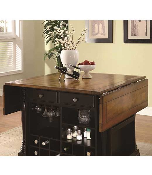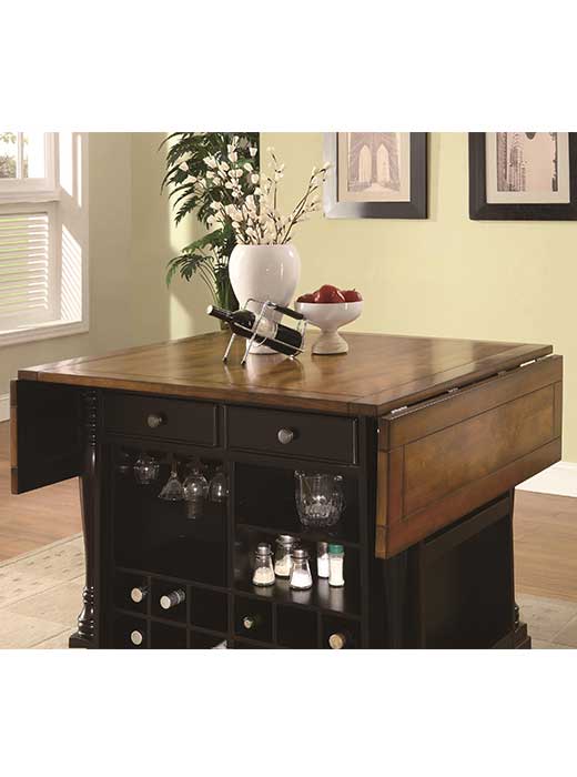 The country cottage styling of this large scale kitchen island will give your home a custom feel at an affordable price. The spacious island features a black finish for the base with tons of built-in organization including cabinets, drawers, wine storage, hanging stemware storage and a spice rack. The cherry finish top has drop leaves at each end to extend the table from 42 to 66 inches long. Fold them down to save space for an efficient kitchen workflow or rise them for a food preparation space. With the leaves up, the island is also place to pull up bar stools for breakfast or a casual meal. The turned columns add to the impressive style of this versatile piece.