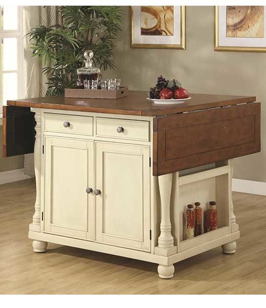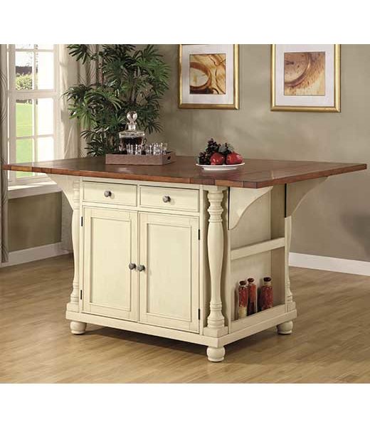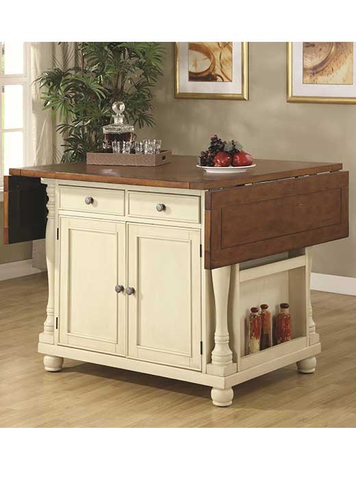 The country cottage styling of this large scale kitchen island will give your home a custom feel at an affordable price. The spacious island features a buttermilk colored finish for the base with tons of built-in organization including cabinets, drawers, wine storage, hanging stemware storage and a spice rack. The cherry finish top has drop leaves at each end to extend the table from 42 to 66 inches long. Fold them down to save space for an efficient kitchen workflow or rise them for a food preparation space. With the leaves up, the island is also place to pull up bar stools for breakfast or a casual meal. The turned columns add to the impressive style of this versatile piece.