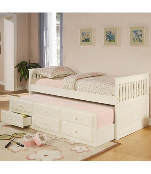This classic daybed will be a wonderful addition to the youth bedroom or spare room in your home. This piece has great style and function, with clean lines, and simple slatted ends. This piece can provide a comfortable place to lounge during the day, and cozy spot to sleep at night. A convenient trundle below allows you to easily accommodate overnight guests, pulling out simply to provide an extra twin size sleeping space. Three spacious storage drawers below the trundle offer lots of space for clothing and extra linens, so you can make the most of your room. Available in Black, White, and rich medium Cherry finishes, this solid wood captain’s bed will be an excellent choice for your home.