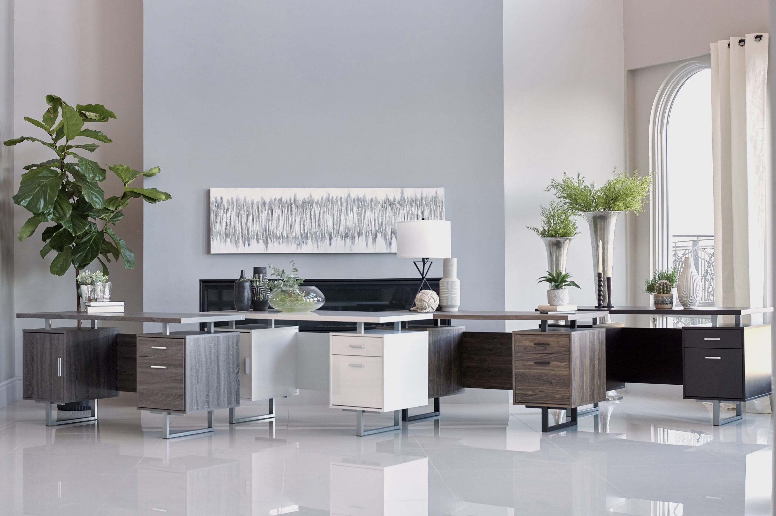 An effortless blend of fashion and functionality, this modern office desk makes it easy to stay productive. The stylish, floating tabletop adds elegant dimension while providing plenty of space to spread out. The roomy storage area down below includes a slide-out drawer, file cabinet, and storage cabinet with plenty of room for essentials. The file cabinet fits both legal and letter size documents to keep important paperwork neatly in place. This stylish desk is beautifully designed with an aged walnut finish and dark bronze metal base for a sophisticated look.