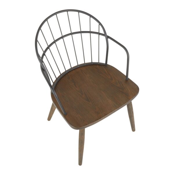 Bring industrial style to your dining room with the Riley Chair by LumiSource. Our updated take on a traditional spindle-back chair the Riley is constructed of dark walnut wood seat and legs with a black metal back and armrests. The perfect chair for a dining table or extra seating.
