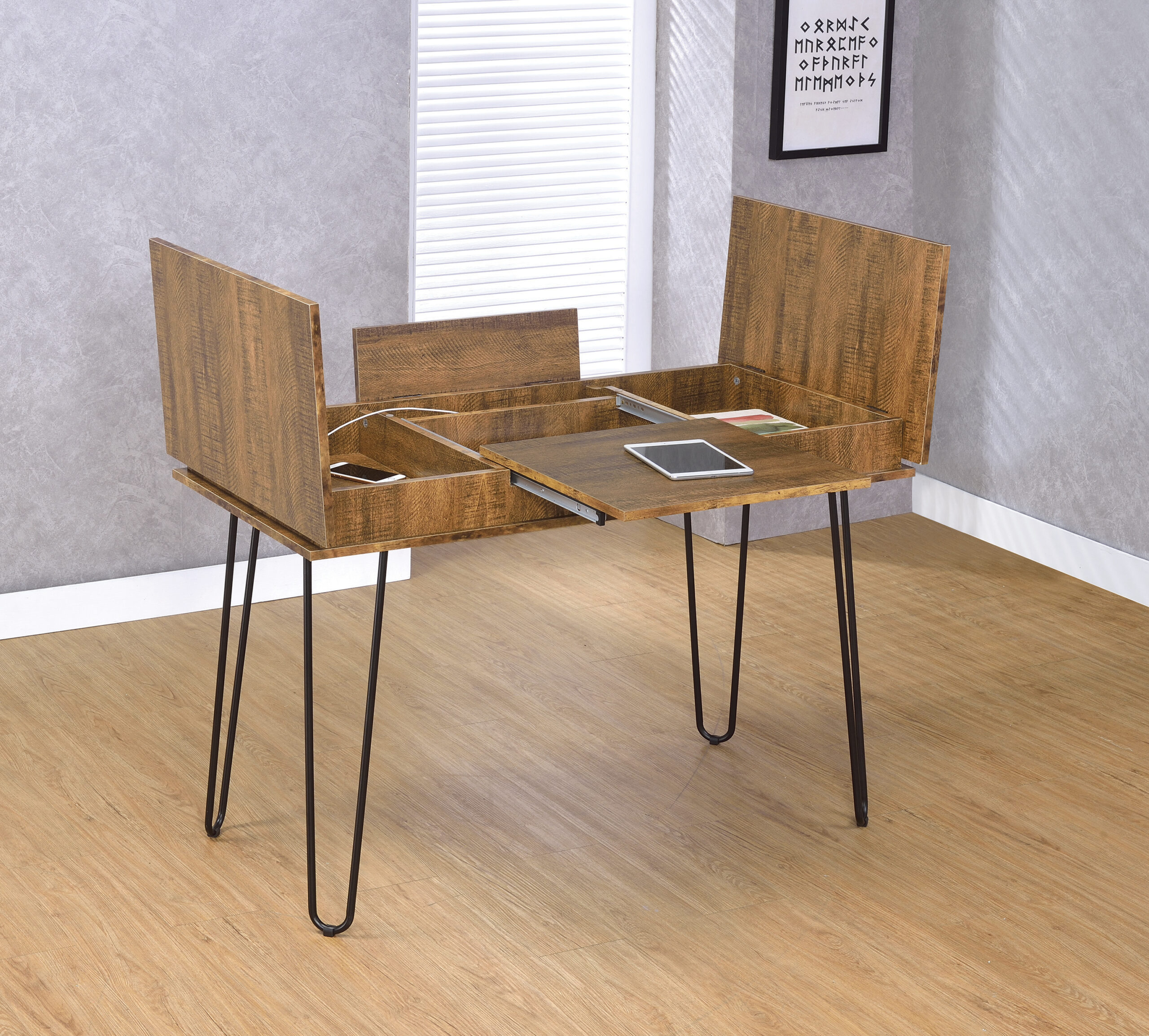 At first glance, it appears to be a simple writing desk with a hint of traditional charm. Yet when you flip open its top and pull out its sliding tray, and it reveals a plethora of pleasing features. Four spacious compartments offer discreet storage for your valuables. A built-in power outlet provides a useful charging station for electronics. With sleek, curved legs and a rustic amber finish, this versatile desk exudes convenience and class.