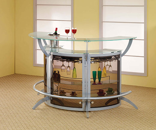 Create a cool party vibe in your home with this bar unit. Featuring a sturdy silver-finished metal frame, with sleek curved base support and a comfortable foot rail. The lower frosted tempered glass offers space to prepare drinks, while the upper frosted glass deck is great for serving. Shelves and stemware storage below sit behind cool tinted acrylic.