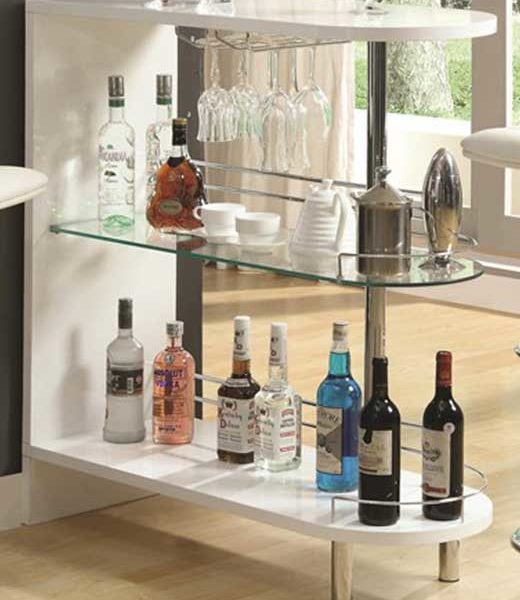 This contemporary bar table is a sleek option for your living room or dining room. The unit includes a unique shape with an arch shape to the table top and shelves. A center glass shelf complements the white color, and chrome color accents on the railing, feet, and support road. Stemware storage where you can hang wine glasses adds to the sophisticated style of this bar unit.